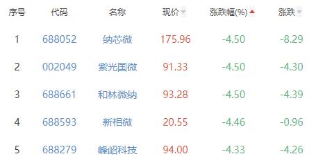 纳芯微、紫光国微、和林微纳、新相微、峰岹科技位列涨幅榜后五位,涨幅分别为-4.50%、-4.50%、-4.50%、-4.46%、-4.33%。