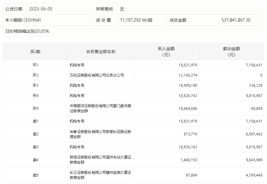本川智能今日涨停,龙虎榜数据显示,上榜营业部席位全天成交9204.43万元,占当日总成交金额比例为17.11%。其中,买入金额为6142.88万元,卖出金额为3061.55万元,合计净买入3081.33万元。