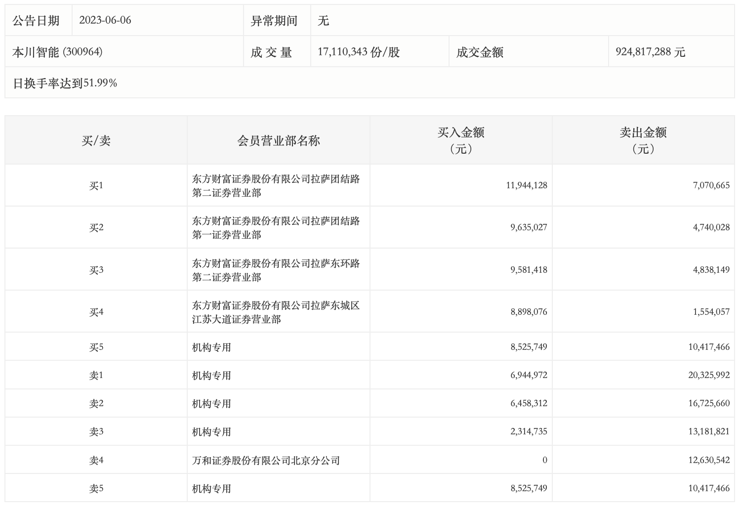 6月6日,本川智能今日涨10.6%,龙虎榜数据显示,上榜营业部席位全天成交1.56亿元,占当日总成交金额比例为16.85%。其中,买入金额为6430.24万元,卖出金额为9148.44万元,合计净卖出2718.2万元。