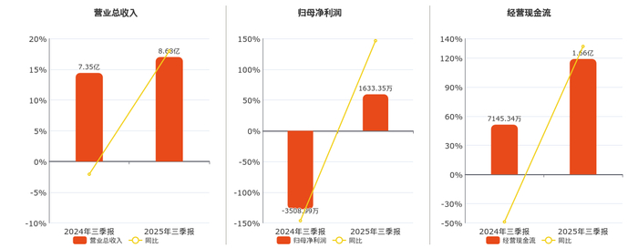 公司营业总收入为8.68亿元。归母净利润为1633.35万元。经营活动现金净流入为1.66亿元。