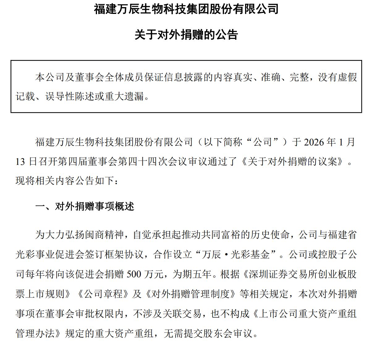 1月14日晚间,万辰集团还公告称,其于1月13日审议通过了对外捐赠议案,将与光彩会合作设立“万辰·光彩基金”。