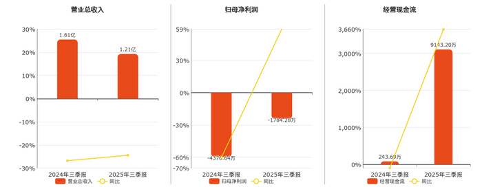 公司营业总收入为1.21亿元,较去年同报告期营业总收入减少3924.31万元,同比较去年同期下降24.44%。归母净利润为-1784.28万元。经营活动现金净流入为9143.20万元。