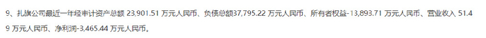 根据公告,扎旗公司2024年经审计资产总额 23,901.51 万元人民币、负债总额37,795.22 万元人民币、所有者权益-13,893.71万元人民币、营业收入51.49万元人民币、净利润-3,465.44万元人民币。