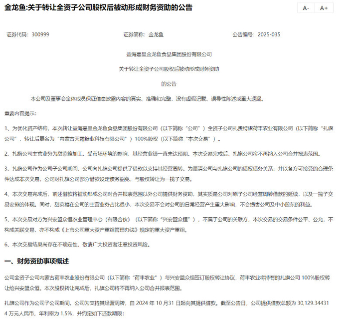 公告显示,扎旗公司主营业务为甜菜糖加工。受市场环境的影响,其经营业绩一直未达预期。此次交易完成后,扎旗公司将不再纳入金龙鱼合并报表范围。