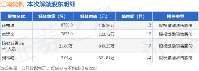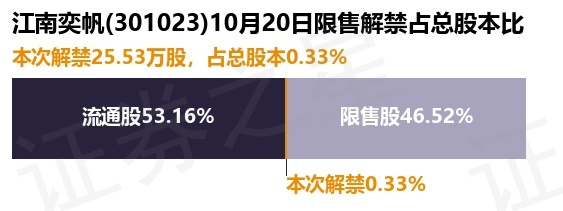 江南奕帆(301023)25.53万股限售股将于10月20日解禁,占总股本0.33%