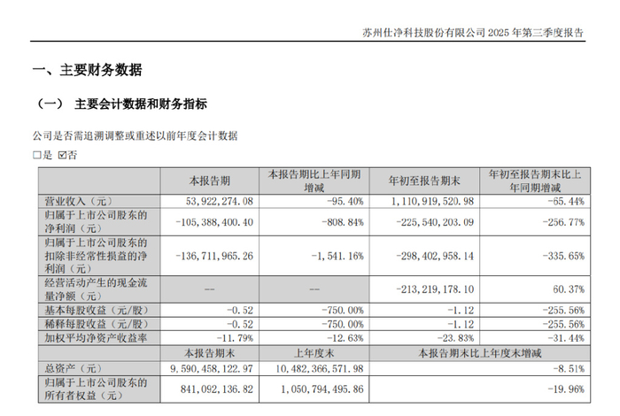 10月26日,仕净科技发布2025年三季报显示,2025年1-9月,公司实现营收11.11亿元,同比下滑65.44%;归母净利润亏损2.25亿元,同比下降-256.77%;扣非后净利润亏损2.98亿元,同比下滑335.65%。