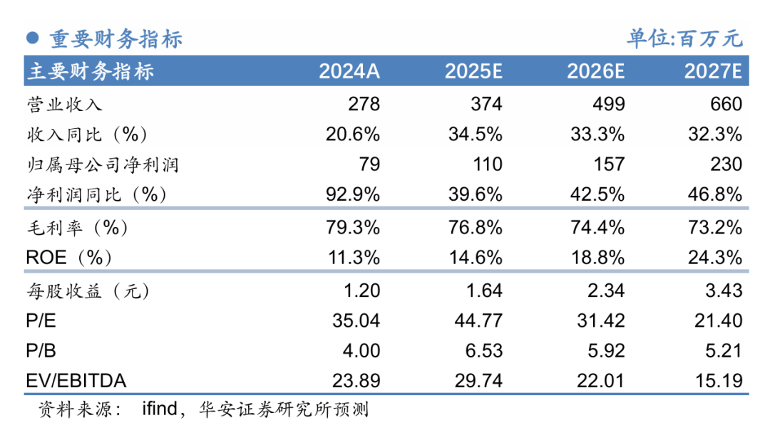 我们预计公司2025-2027年营业收入有望分别实现3.74/4.99/6.60亿元,同比增长34.5%/33.3%/32.3%;归母净利润分别实现1.10/1.57/2.30亿元,同比增长39.6%/42.5%/46.8%;对应EPS为1.64/2.34/3.43元;对应PE倍数为45/31/21X。维持“买入”评级。