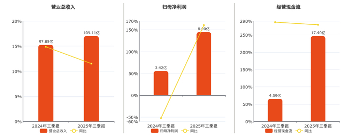 公司营业总收入为109.11亿元。归母净利润为8.90亿元。经营活动现金净流入为17.40亿元。