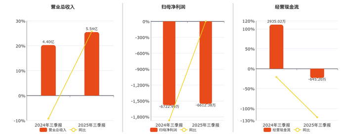 公司营业总收入为5.54亿元。归母净利润为-6612.38万元。经营活动现金净流入为-645.20万元,较去年同报告期经营活动现金净流入减少3580.22万元,同比较去年同期下降121.98%。