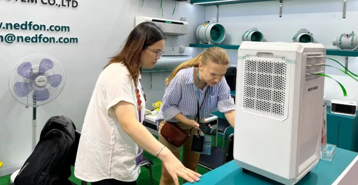 (绿岛风团队与全球客户密切沟通公司供图)在绿岛风产品体验区,全系列新风系统、除湿机、风幕机等明星产品,凭借精湛工艺和切实的空气改善效果,吸引了众多客户驻足感受。