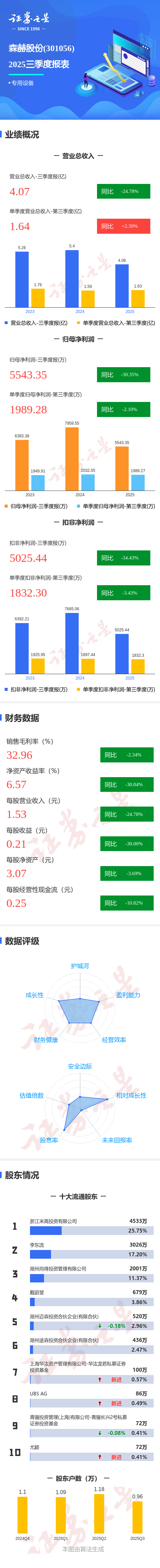 证券之星消息,森赫股份2025年三季报显示,公司主营收入4.07亿元,同比下降24.78%;归母净利润5543.35万元,同比下降30.36%;扣非净利润5025.44万元,同比下降34.44%;其中2025年第三季度,公司单季度主营收入1.64亿元,同比上升2.39%;单季度归母净利润1989.28万元,同比下降2.1%;单季度扣非净利润1832.3万元,同比下降3.43%;负债率37.35%,投资收益352.71万元,财务费用-960.22万元,毛利率32.96%。