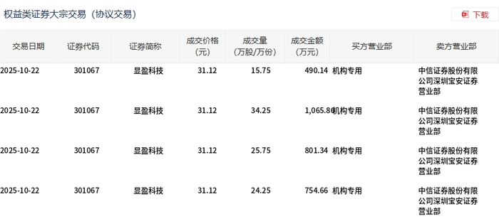 10月22日,显盈科技大宗交易成交100万股,成交额3112万元,占当日总成交额的18.17%,成交价31.12元,较市场收盘价34.22元折价9.06%。