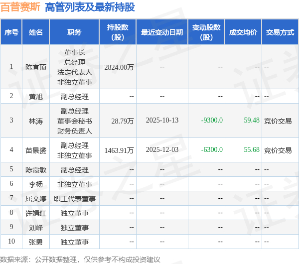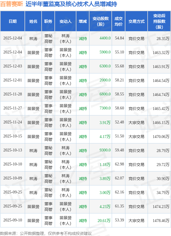 百普赛斯:12月4日高管苗景赟、林涛减持股份合计1.03万股
