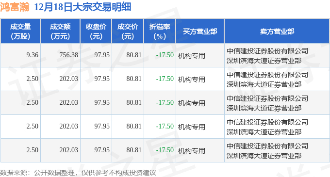 证券之星消息,12月18日鸿富瀚发生大宗交易,交易数据如下: