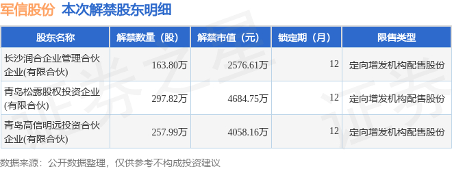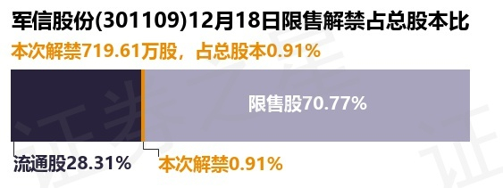 军信股份(301109)719.61万股限售股将于12月18日解禁,占总股本0.91%