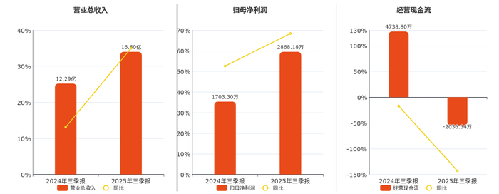 公司营业总收入为16.60亿元。归母净利润为2868.18万元。经营活动现金净流入为-2036.34万元,较去年同报告期经营活动现金净流入减少6775.14万元,同比较去年同期下降142.97%。
