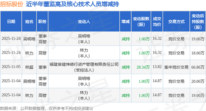 招标股份:11月24日高管吴明禧、林力减持股份合计2万股