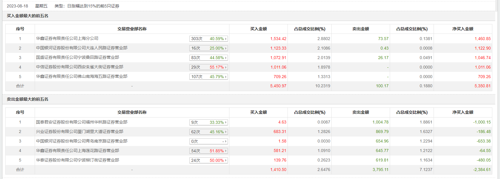 8月18日,哈焊华通今日涨停,全天换手率达56.63%,振幅达19.6%。龙虎榜数据显示,营业部席位合计净买入2966.2万元。其中,华鑫证券上海分公司、中国银河证券大连人民路证券营业部分别买入1534.42万元、1123.33万元;国泰君安证券福州华林路证券营业部、兴业证券厦门湖里大道证券营业部分别卖出1004.78万元、869.79万元。