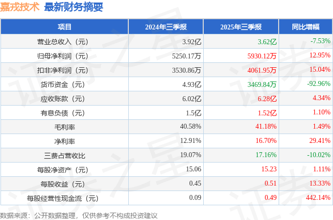 据证券之星公开数据整理,近期嘉戎技术(301148)发布2025年三季报。截至本报告期末,公司营业总收入3.62亿元,同比下降7.53%,归母净利润5930.12万元,同比上升12.95%。按单季度数据看,第三季度营业总收入1.5亿元,同比上升5.03%,第三季度归母净利润3092.38万元,同比上升11.73%。本报告期嘉戎技术盈利能力上升,毛利率同比增幅1.49%,净利率同比增幅29.41%。