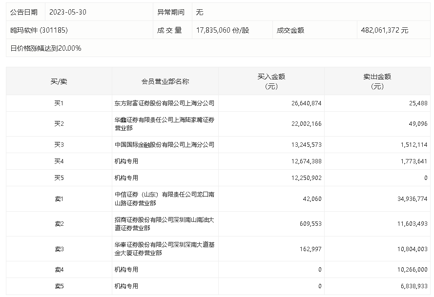 5月30日,鸥玛软件今日涨停,龙虎榜数据显示,上榜营业部席位全天成交1.65亿元,占当日总成交金额比例为34.32%。其中,买入金额为8762.85万元,卖出金额为7780.95万元,合计净买入981.9万元。