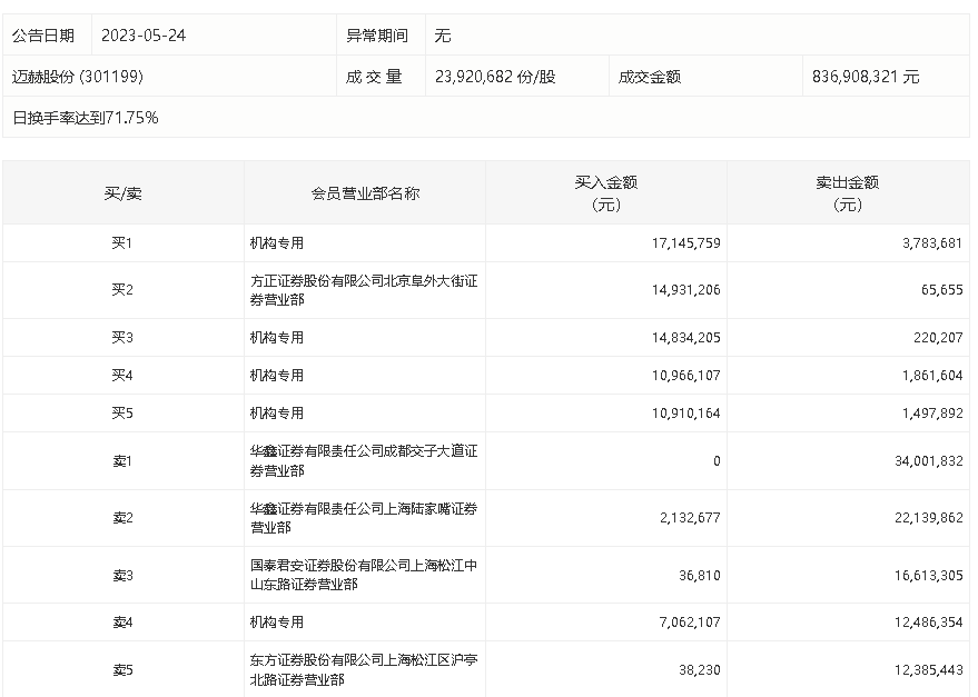 5月24日,迈赫股份今日涨16.97%,龙虎榜数据显示,上榜营业部席位全天成交1.83亿元,占当日总成交金额比例为21.88%。其中,买入金额为7805.73万元,卖出金额为1.05亿元,合计净卖出2699.86万元。