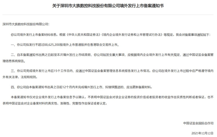 智通财经APP获悉,12月19日,中国证监会国际合作司发布《关于深圳市大族数控科技股份有限公司境外发行上市备案通知书》。大族数控(301200.SZ)拟发行不超过88,625,200股境外上市普通股并在香港联合交易所上市。