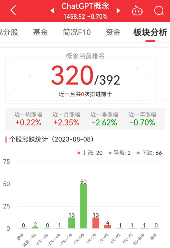中国经济网北京8月8日讯今日,ChatGPT概念板块整体跌幅0.70%,其中20只股票上涨,2只股票平盘,66只股票下跌。