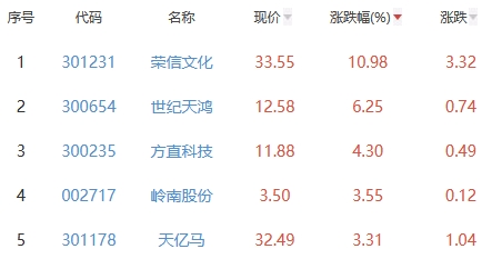 其中,荣信文化、世纪天鸿、方直科技、岭南股份、天亿马位列板块涨幅前五位,涨幅分别为10.98%、6.25%、4.30%、3.55%、3.31%。