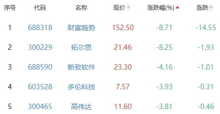 财富趋势、拓尔思、新致软件、多伦科技、高伟达位列涨幅榜后五位,涨幅分别为-8.71%、-8.25%、-4.16%、-3.93%、-3.81%。