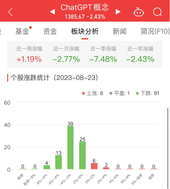 中国经济网北京8月23日讯今日,ChatGPT概念板块整体跌幅2.43%,其中,8只股票上涨,1只股票平盘,81只股票下跌。