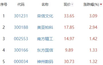 其中,荣信文化、美亚柏科、南方精工(维权)、东方国信(维权)、神州数码位列板块涨幅前五位,涨幅分别为3.09%、2.94%、1.42%、1.33%、1.32%。