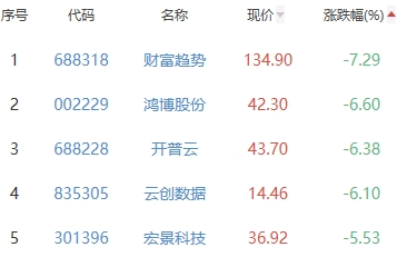 财富趋势、鸿博股份、开普云、云创数据、宏景科技位列涨幅榜后五位,涨幅分别为-7.29%、-6.60%、-6.38%、-6.10%、-5.53%。