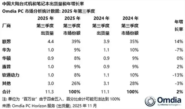 Omdia分析师明确指出,2025年第三季度笔记本电脑出货量与去年同期持平,部分原因是上年同期政府推出的消费补贴政策影响力在本季度已显著减弱。这对于此前在消费市场较为活跃的品牌构成了直接冲击。同时,市场的增量正越来越多地向具备生态协同能力和技术号召力的头部品牌集中。例如,华为虽然在本季度PC出货量也出现-7%的小幅下滑,但其鸿蒙OS PC的发布被认为可能在中长期重新定义市场格局;联想则以14%的增长率巩固了其龙头地位,市场份额达到39%。这导致缺乏独特生态和品牌引领力的厂商,市场份额更易于被挤压。