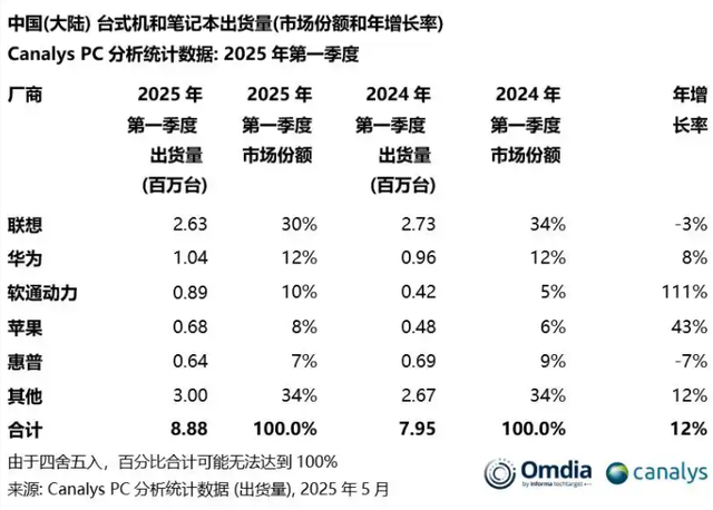 回顾2025年第一季度,根据Omdia数据显示,软通动力在中国大陆PC市场中曾以111%的增长率排名第三,出货量甚至超越了苹果和惠普。当时,行业分析指出,以软通动力、华为为代表的专注消费市场的本土品牌,正在通过积极的竞争蚕食联想、惠普、戴尔等传统巨头的份额,市场格局发生显著变化。然而,到了第三季度,这一增长势头显然未能延续。