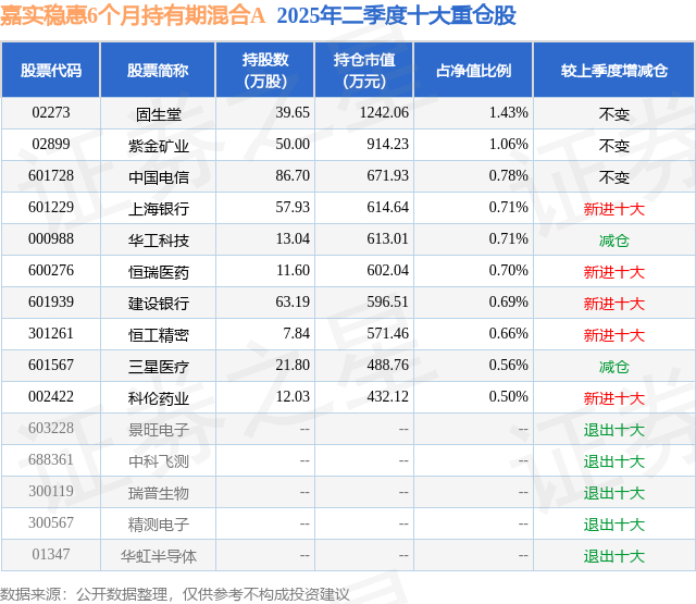 嘉实稳惠6个月持有期混合A的前十大重仓股如下: