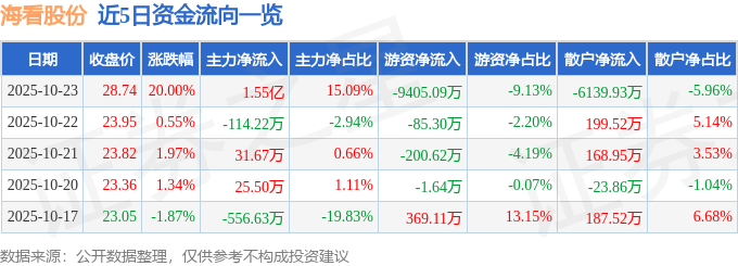 证券之星消息,海看股份10月23日涨停收盘,收盘价28.74元。该股于10点21分涨停,17次打开涨停,截止收盘封单资金为501.23万元,占其流通市值0.14%。