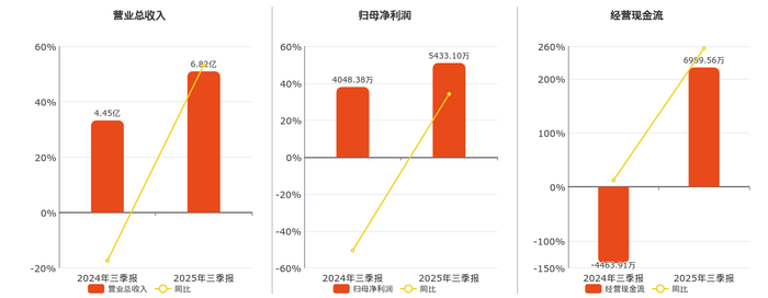 公司营业总收入为6.82亿元。归母净利润为5433.10万元。经营活动现金净流入为6989.56万元。