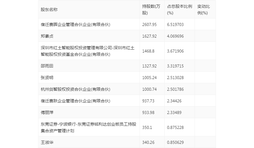 半年报显示,2024年上半年末公司十大流通股东中,持股最多的为宿迁赛晖企业管理合伙企业(有限合伙),占比6.52%。十大流通股东名单相比2024年一季报维持不变。在具体持股比例上,宿迁赛晖企业管理合伙企业(有限合伙)、郑素贞、深圳市红土智能股权投资管理有限公司-深圳市红土智能股权投资基金合伙企业(有限合伙)、邵雨田、张贤明、杭州剑智股权投资合伙企业(有限合伙)、宿迁赛跃企业管理合伙企业(有限合伙)、傅丽萍持股有所下降。