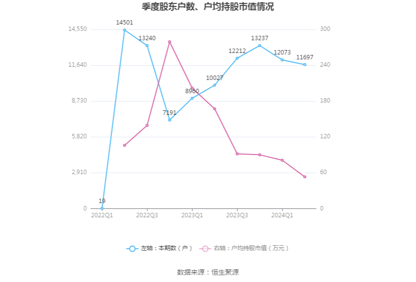 筹码集中度方面,截至2024年上半年末,公司股东总户数为1.17万户,较一季度末下降了376户,降幅3.11%;户均持股市值由一季度末的81.01万元下降至53.18万元,降幅为34.35%。