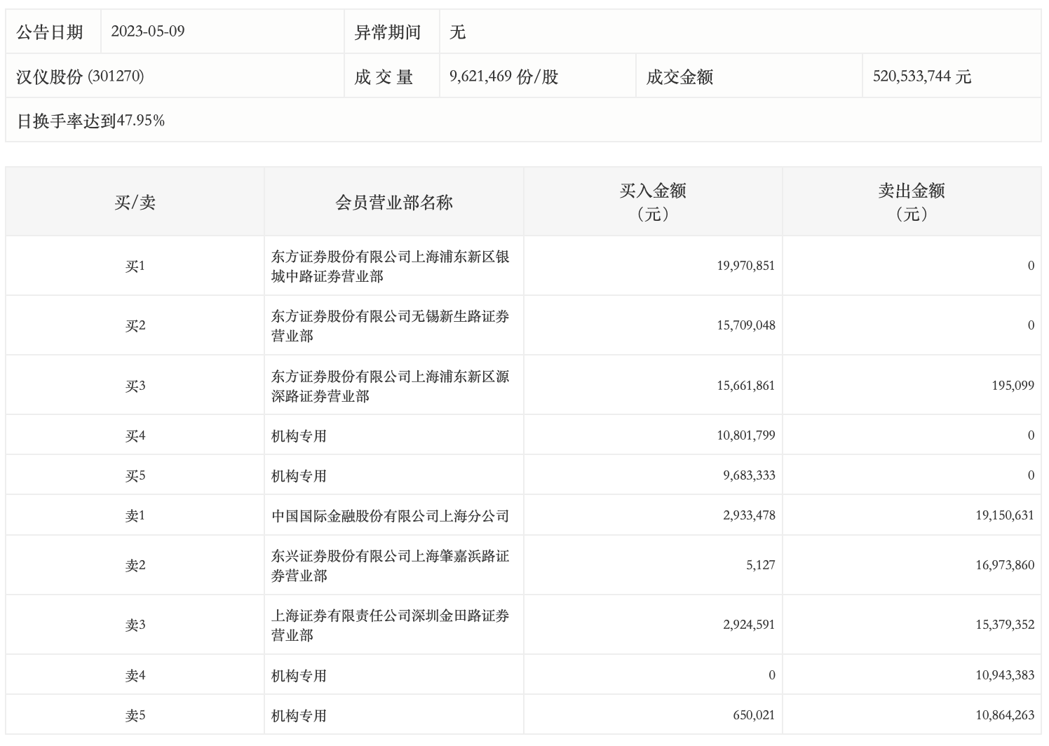 5月9日,汉仪股份今日涨12.66%,龙虎榜数据显示,上榜营业部席位全天成交1.52亿元,占当日总成交金额比例为29.17%。其中,买入金额为7834.01万元,卖出金额为7350.66万元,合计净买入483.35万元。