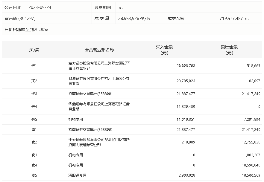 5月24日,富乐德今日涨停,龙虎榜数据显示,上榜营业部席位全天成交1.72亿元,占当日总成交金额比例为23.89%。其中,买入金额为9767.91万元,卖出金额为7426.04万元,合计净买入2341.86万元。