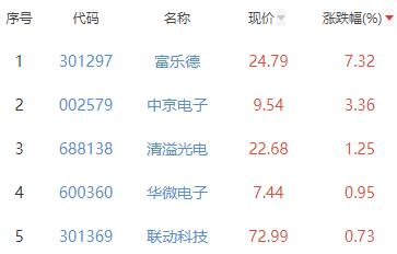 其中,富乐德、中京电子、清溢光电、华微电子、联动科技位列板块涨幅前五位,涨幅分别为7.32%、3.36%、1.25%、0.95%、0.73%。