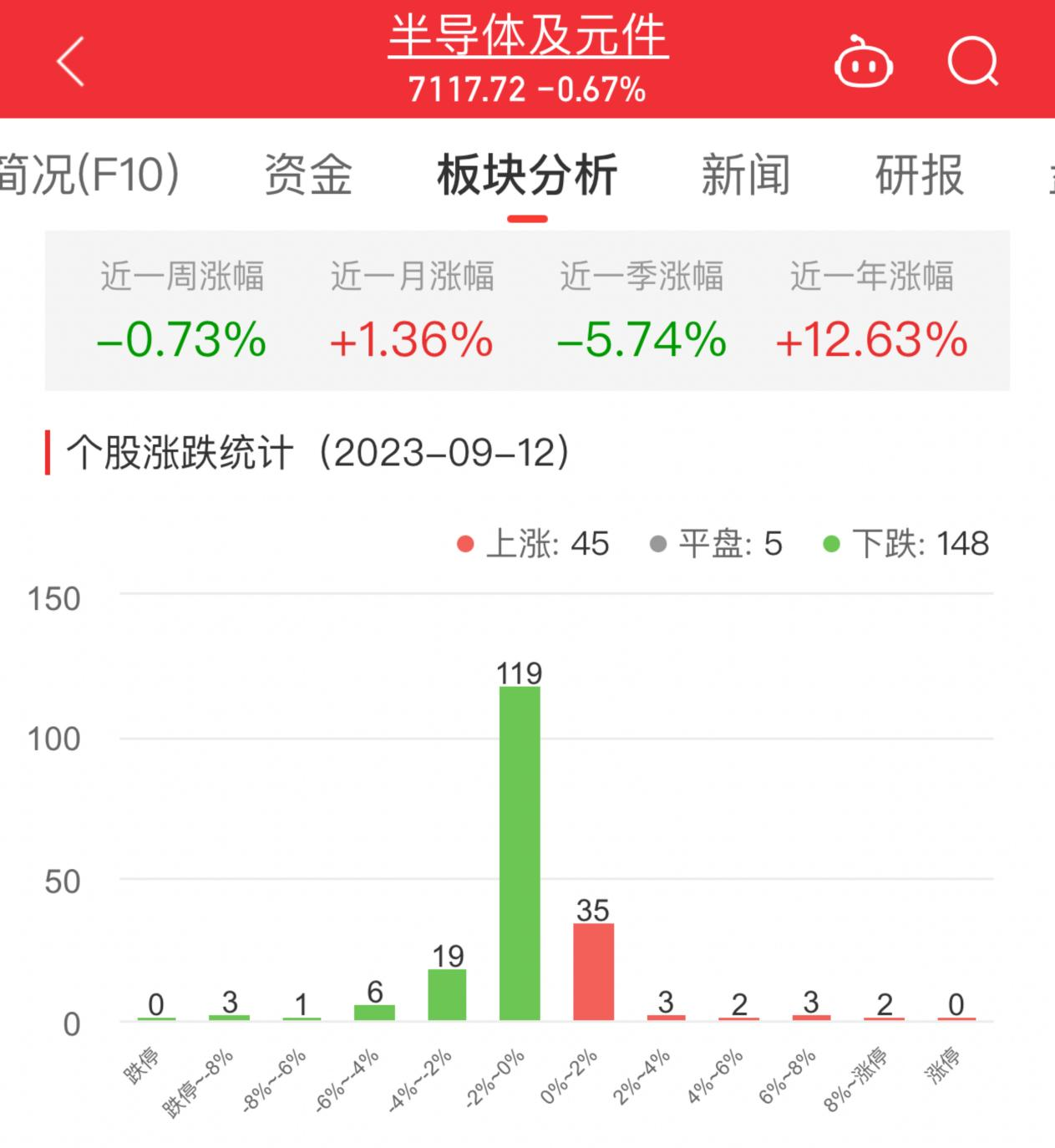 中国经济网北京9月12日讯 今日,半导体及元件板块整体跌幅0.67%,其中45只股票上涨,5只股票平盘,148只股票下跌。