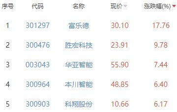 其中,富乐德、胜宏科技、华亚智能、本川智能、科翔股份位列板块涨幅前五位,涨幅分别为17.76%、9.78%、7.44%、6.40%、6.17%。