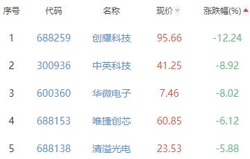 创耀科技、中英科技、华微电子、唯捷创芯、清溢光电位列涨幅榜后五位,涨幅分别为-12.24%、-8.92%、-8.02%、-6.12%、-5.88%。