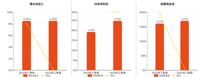 公司营业总收入为13.86亿元。归母净利润为2.49亿元。经营活动现金净流入为3.67亿元。