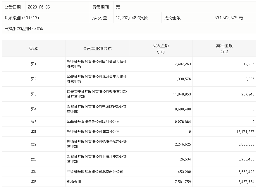 6月5日,凡拓数创今日涨停,龙虎榜数据显示,上榜营业部席位全天成交1.2亿元,占当日总成交金额比例为22.65%。其中,买入金额为7195.03万元,卖出金额为4846.01万元,合计净买入2349.01万元。