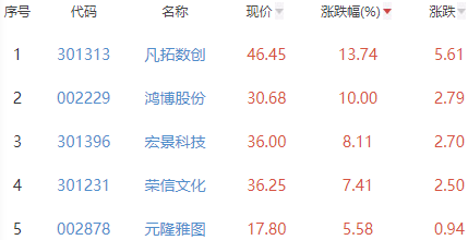 其中,凡拓数创、鸿博股份、宏景科技、荣信文化和元隆雅图位列板块涨幅前五位,涨幅分别为13.74%、10.00%、8.11%、7.41%和5.58%。