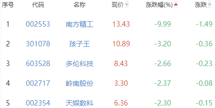 南方精工、孩子王、多伦科技、岭南股份和天娱数科位列涨幅榜后五位,涨幅分别为-9.99%、-3.20%、-2.66%、-2.37%和-2.30%。