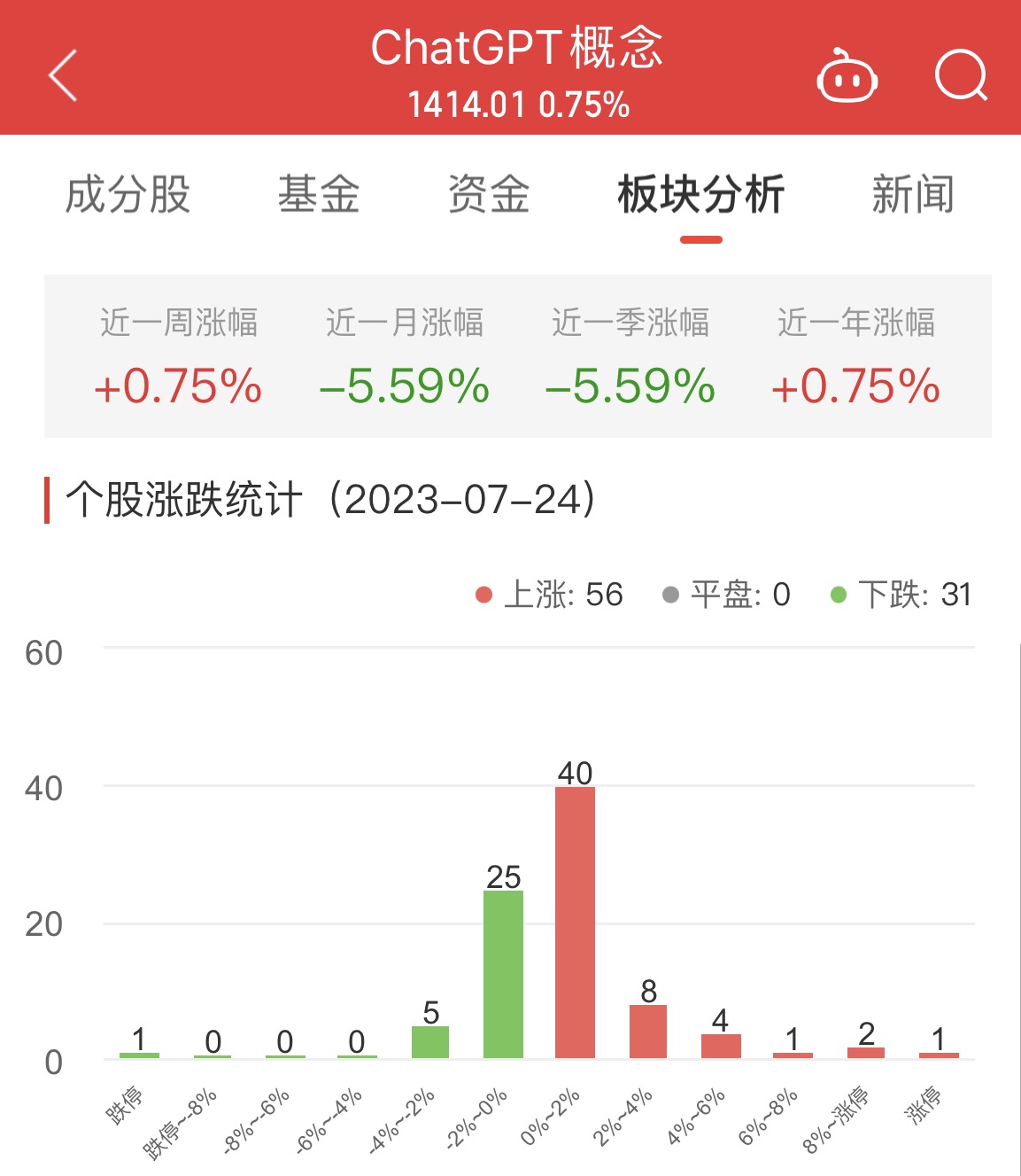 数据显示,截至今日,ChatGPT概念板块近一周涨幅0.75%,近一月涨幅-5.59%,近一季涨幅-5.59%。